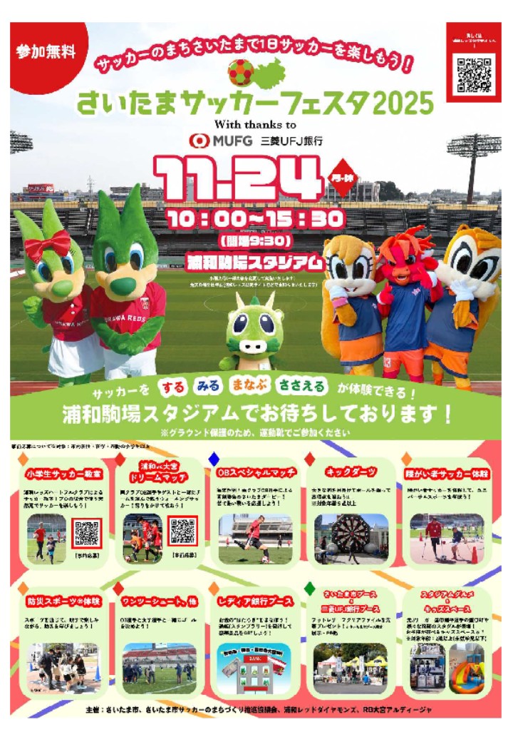 2025-11-18 / 最終更新日時 : 2025-11-21 fconetop 試合やイベント 11/24サッカーフェスタ2025 【集合〜準備】 8:00 集合/MTG 8:15 集合写真 8:20〜9:20 会場設営/各GでMTG・ウォーミングアップ 9:30〜 開場 9:50〜 第1クール 参加者集合 10:00〜 第1クール 開始 詳細は浦和レッズ公式サイトにて⚽